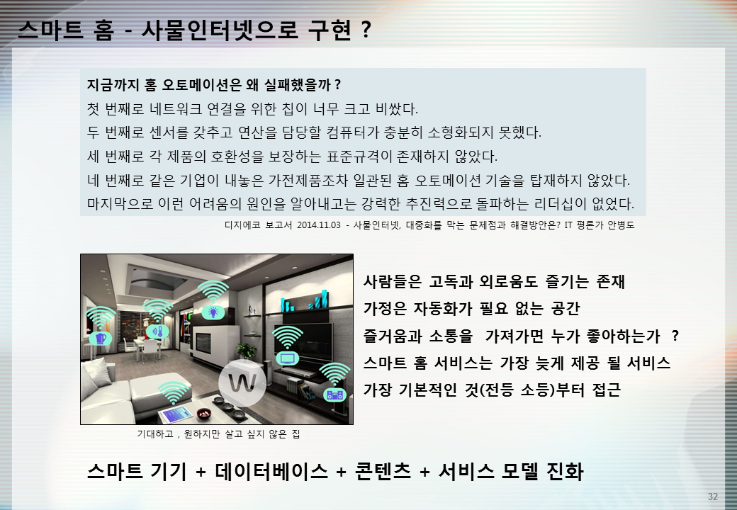 스마트 홈은 홈 오토메이션과 동일한 의미를 갖는데 실제 생활에 적용이 상당히 늦은 편이다. 아래 그림은 강의용 파일에서 캡처한 자료이다.