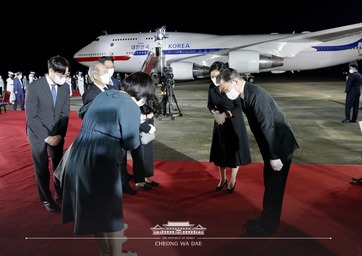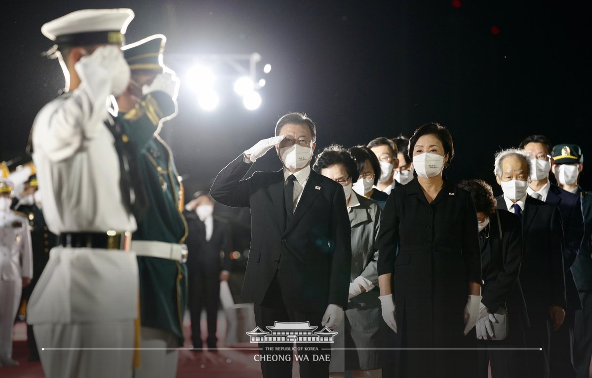 끝으로 문 대통령은 "영웅께 대하여 경례" 안내에 따라 운구 차량 행렬이 공항을 완전히 떠날 때까지 거수 경례하며 예를 갖추었습니다. 그 후 문 대통령 부부는 유족들에게 허리 숙여 인사하고 흐느끼는 두 따님의 손을 잡고 포옹하며 위로했습니다.