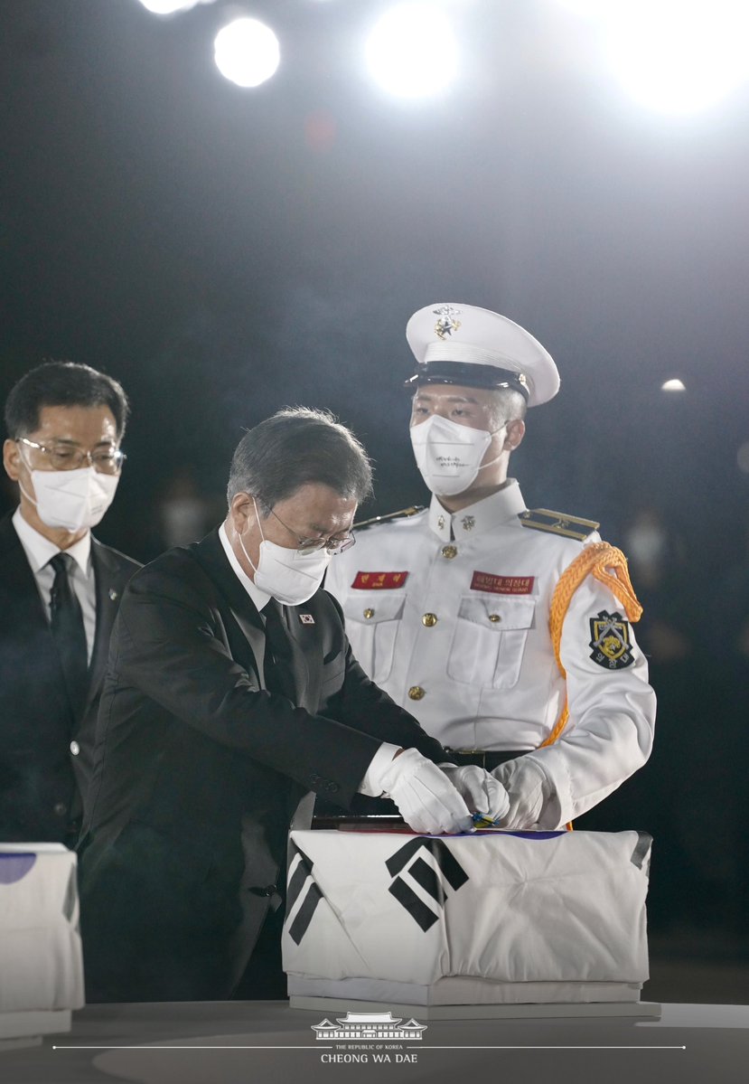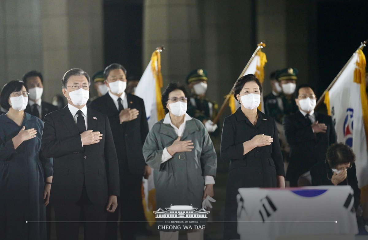 문재인 대통령은 23일 밤 서울공항에서 “대한민국의 이름으로 당신을 기억하겠습니다”라는 주제로 국군 전사자 유해 봉환식을 주관했습니다. 문 대통령이 국군 전사자 유해 봉환식을 주관한 것은 세 번째입니다. 문 대통령은 신원 확인된 故 김석주·정환조 일병의 유해를 대통령 전용기로 모셨습니다.