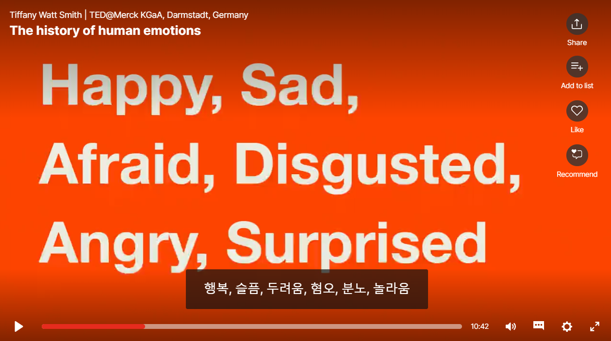 지금 우리가 살고 있는 시대에는 이런 감정에 대한 이해가 필수적입니다. 많은 것들을 설명해 주기도 하지만, 정치인들에게 이용되기도, 컴퓨터 알고리즘에 의해 조작되기도 합니다. 감성 지능, 즉 자신과 타인의 감정을 인지하고 명명할 수 있는 이 능력은, 이제 학교와 기업에서 교육할 만큼 아주 중요시되고 있습니다. 의료계에서도 장려하고 있죠. 하지만 이런 노력에도 불구하고, 가끔 이런 생각이 듭니다. 우리가 감정에 접근하는 방식이 계속 뒤처지고 있는 것이 아닌지 말이죠. 감정이란 것이 도대체 무엇인지 애매할 때도 있습니다.