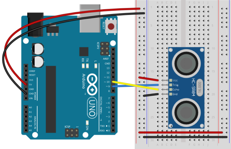 센서를 작동하려면 센서의 트리거 핀에 10마이크로초의 로우-하이 펄스를 보냅니다. 이것은 센서가 초음파 신호를 보내도록 합니다. 그런 다음 에코 핀의 펄스 길이를 측정하여 신호가 반환되는 데 걸린 시간을 알 수 있습니다.