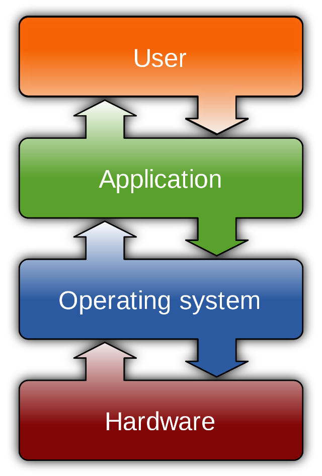 소프트웨어는 응용 프로그램과 운영 체제의 두 가지 유형이 있습니다. 응용 프로그램은 하드웨어가 데이터를 조작할 수 있도록 하는 프로그램입니다. 워드 프로세서가 키보드를 통해 입력된 데이터를 읽고, 입력된 데이터를 그래픽 인터페이스를 통해 디스플레이에 표시하고, 워드 파일을 2차 저장소에 저장하고, 그 워드 파일을 프린터로 인쇄하게 하는 것처럼 워드 프로세서입니다. 데이터(또는 정보)는 언제든지 런타임 데이터 또는 저장 장치의 파일에 저장된 데이터가 될 수 있습니다. 응용 프로그램은 프로그램이라는 파일로 보조 저장소에 저장됩니다. 실행 중에 실행되는 이러한 파일이나 프로그램을 프로세스라고 합니다. 프로세스는 하드웨어 구성 요소에 직접 액세스 할 수 없습니다. 하드웨어 리소스, 물리적 메모리, 데이터 파일 및 하드웨어 간 데이터 전송을 관리하는 또 다른 소프트웨어가 필요합니다. 이 소프트웨어를 운영 체제라고 합니다.
