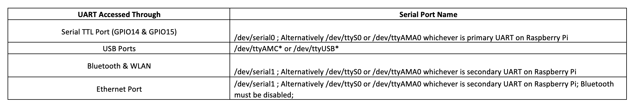 USB-to-Serial 보드는 Raspberry Pi의 직렬 TTL 포트에 연결됩니다. 따라서 /dev/serial0이 아니면 /dev/ttyS0 또는 /dev/ttyAMA0이 해당 Raspberry Pi 모델의 기본 UART인 것이 직렬 포트로 지정되어야 합니다. Raspberry Pi가 USB-to-USB 케이블을 사용하여 컴퓨터에 직접 연결된 경우 컴퓨터의 USB 연결을 /dev/ttyAMC*로 식별할 수 있습니다.