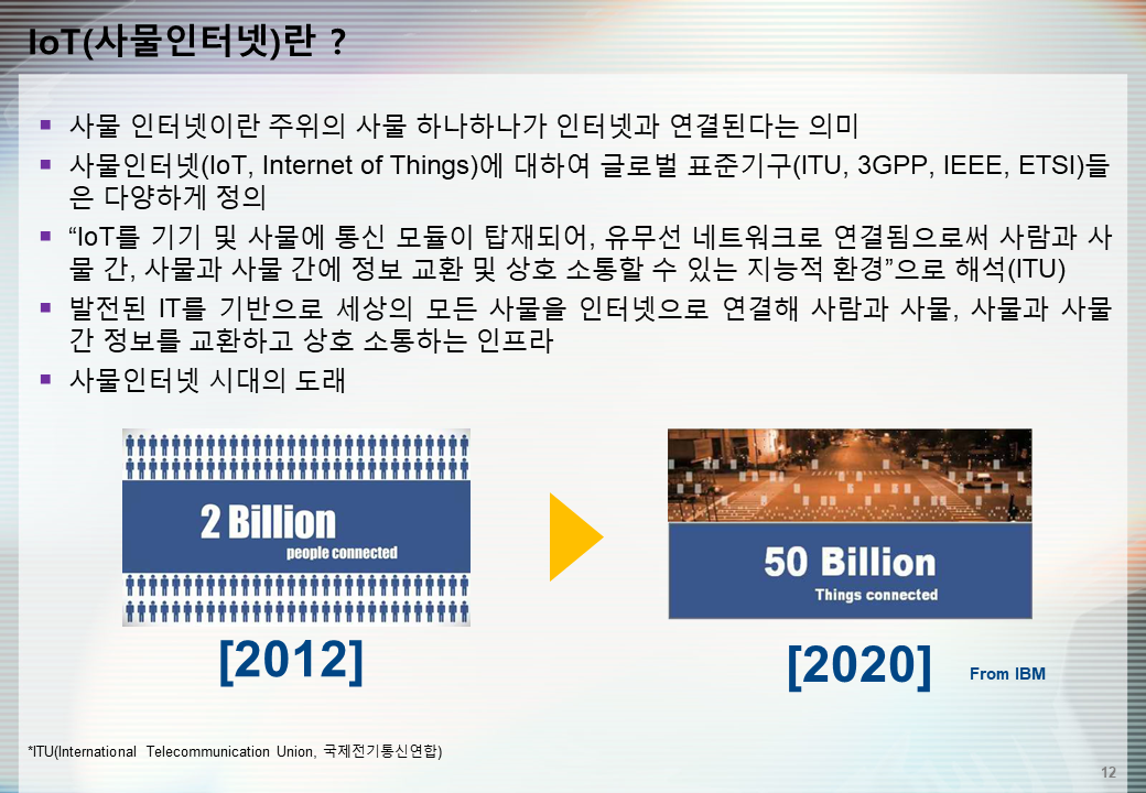 ITU-T(International Telecommunication Union)에 따르면 현재 존재하며 진화하는 상호 운용 가능한 정보 통신 기술을 기반으로(물리적 및 가상) 사물을 상호 연결하여 고급 서비스를 가능하게 하는 정보 사회를 위한 글로벌 인프라입니다.
