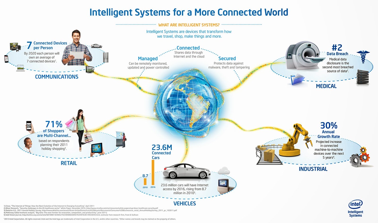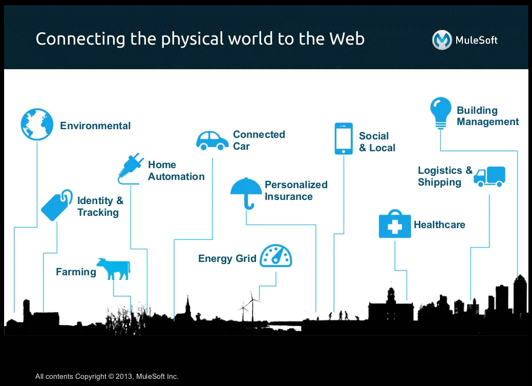 따라서 이러한 정보 기술의 통합으로 일상의 모든 것이 인터넷에 연결되는 것뿐만 아니라 상호 연결됩니다. 가전제품이 스마트폰으로 제어되고 작동되는 것처럼 세계 어디에서나 보안 카메라와 잠금장치에 액세스 할 수 있고, 우산이 기상 조건을 감지하고 외출하기 전에 가져와야 한다고 경고하며, 약병의 깜박임은 복용 시간이 되었음을 사용자에게 알려줍니다. 따라서 기본적으로 모든 일반적인 사용 물품(예: 가전제품, 자동차, 차량, 에너지 그리드, 건강 장치 및 일상생활에서 사용 가능한 모든 상품)에는 소프트웨어 인텔리전스가 내장되어 서로 연결되어 있습니다. 인터넷 플랫폼에 연결되어 이러한 공통 개체를 고유한 방식으로 더 똑똑하고 더 우수하고 지능적으로 만듭니다.