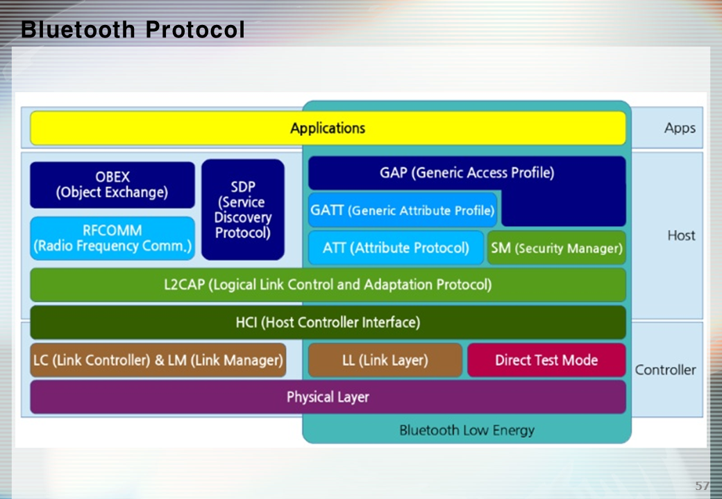 BLE는 작은 배터리로 몇 년 동안 전원을 공급할 수 있는 IOT 장치용으로 설계되었습니다. OSI 모델의 물리적 및 데이터 링크 계층은 모두 Bluetooth Low Energy에서 구현됩니다. BLE 프로토콜 스택은 컨트롤러와 호스트의 두 부분으로 구성됩니다. 아키텍처에서 물리적 및 링크 계층은 컨트롤러 부분에서 구현됩니다. 컨트롤러는 일반적으로 Bluetooth 장치에 라디오가 있는 SOC(System on Chip)입니다. GAP, GATT 서비스, 보안 관리자와 같은 나머지 사항은 호스트 부분에 포함됩니다. 최소한 블루투스의 GAP(Generic Access Profile) 서비스는 BLE 장치가 다른 BLE 장치를 관찰하고 연결할 수 있도록 합니다(필요한 경우에만). Bluetooth LE의 GATT(Generic Attribute Profile) 서비스를 사용하면 다른 장치가 해당 Bluetooth 장치에 있는 서비스 및 특성에 액세스할 수 있습니다.
