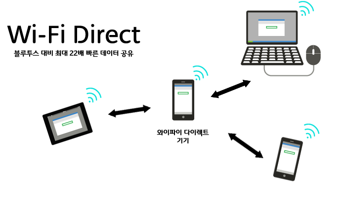4) Wi-Fi Direct – Wi-Fi Direct는 Wi-Fi 표준의 Pear to Pear 버전입니다. 와이파이 다이렉트란 와이파이 기술의 새 버전로 가장 큰 특징은 기기간 통신이 가능하다는 점이다. 핫스팟, 라우터, AP가 없이도 와이파이 다이렉트가 설치된 기기만 있다면 기기끼리 서로 통신하여 정보를 공유할 수 있습니다. 기존에 무선인터넷을 이용하기 위해서는 무선공유기, 즉 엑세스포인트(AP)가 있어야 가능했습니다. 예를 들어 휴대폰에 있는 사진을 TV로 전송하려면 AP를 통해서만 가능했죠. 하지만 와이파이 다이렉트는 애드훅(ad-hoc)이라는 기술을 활용하여 액세스포인트(AP)를 없이도 직접 데이터 전송이 가능합니다.
