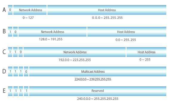 표준에는 A, B, C, D 및 E의 5가지 IPv4 클래스가 있습니다. IPv4 주소의 클래스는 IP 주소의 첫 번째 옥텟으로 식별됩니다. 클래스 A, B 및 C가 가장 일반적으로 사용됩니다. 클래스 D는 멀티캐스팅용으로, 클래스 E는 실험용으로 예약되어 있습니다.