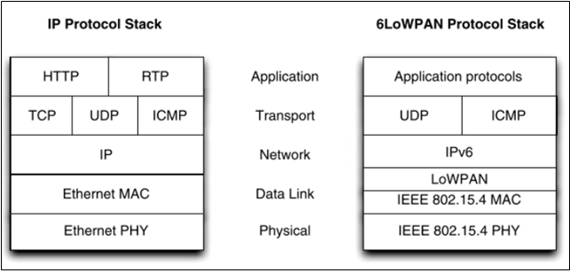 IPv6 저전력 무선 개인 영역 네트워크(6LoWPAN)는 무선 개인 영역 네트워크용 IPv6 표준 기반 네트워크 계층 프로토콜입니다. 물리 계층의 802.15.4 프로토콜을 기반으로 하는 이 표준은 WSN(무선 센서 네트워크)에서 IoT 센서 및 장치의 주소 지정을 위해 개발되었습니다. 이 프로토콜은 모든 장치(제약된 장치 및 대형 장치)와 메모리 부족, 네트워크 손실 등 제한된 기능을 가진 저전력 장치에 인터넷 프로토콜을 구현하기 위한 IPv6의 수정된 버전입니다. IPv6은 250Kbps 전송 데이터 속도의 주파수 범위 2.4GHz에서만 동작합니다.