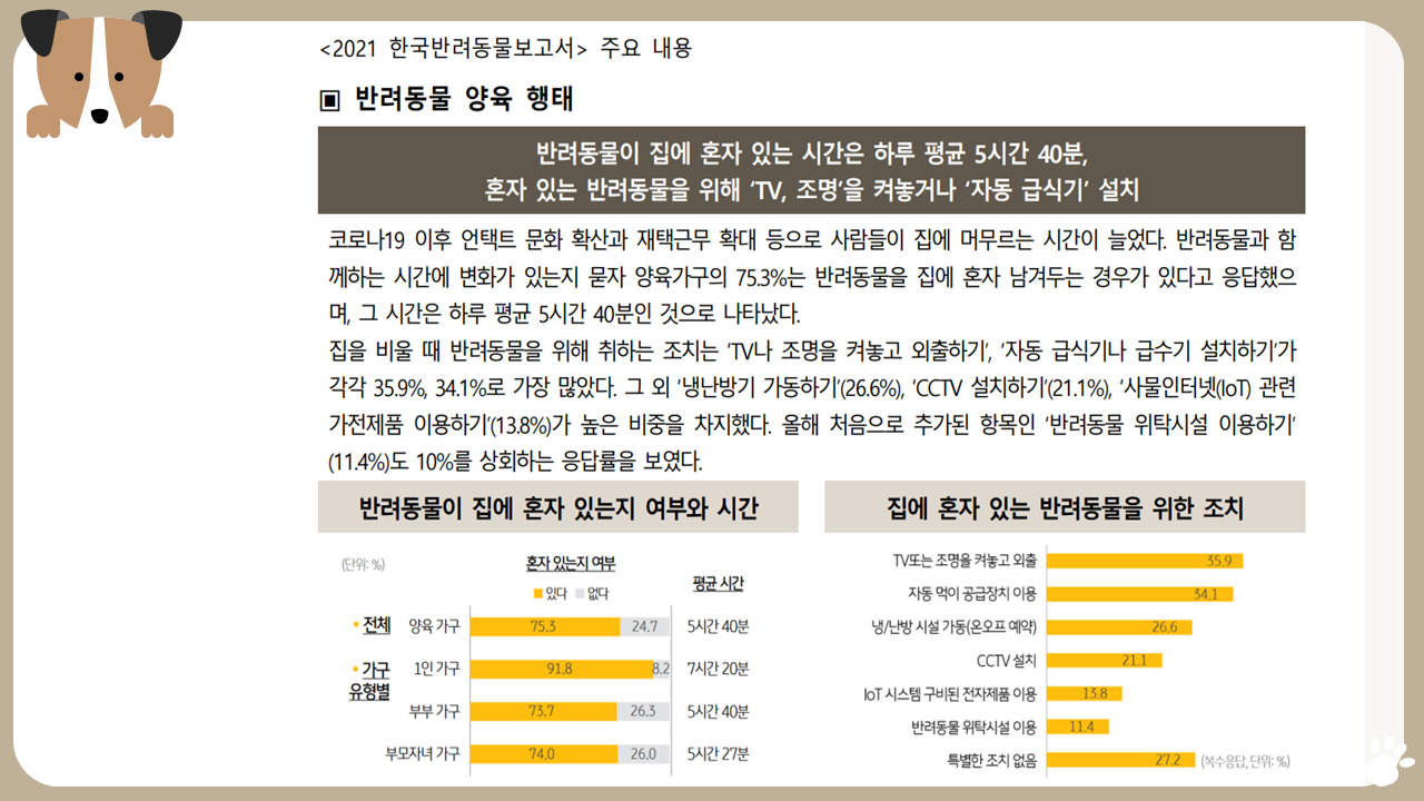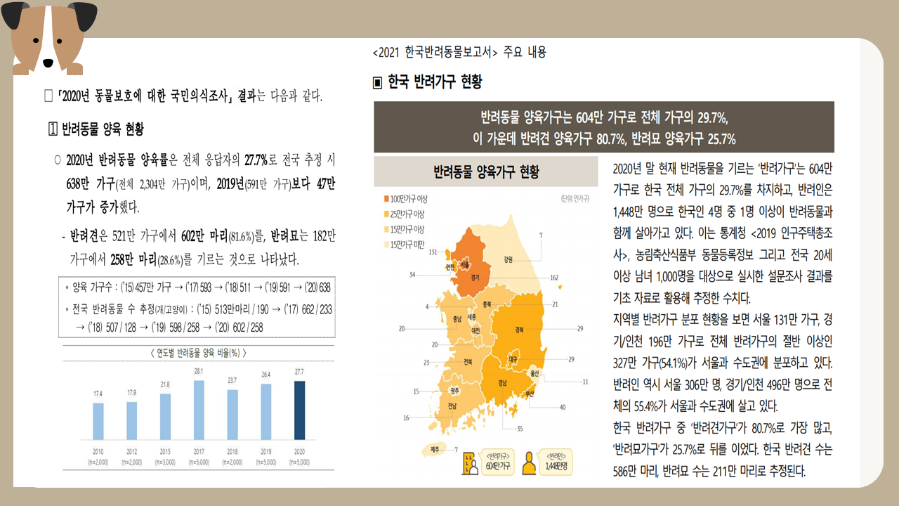반려동물에 대한 이해를 돕기 위해 KB 금융 그룹에서 발행한 2021년 한국 반려동물 보고서를 요약본과 원본 두 개를 참고한다.