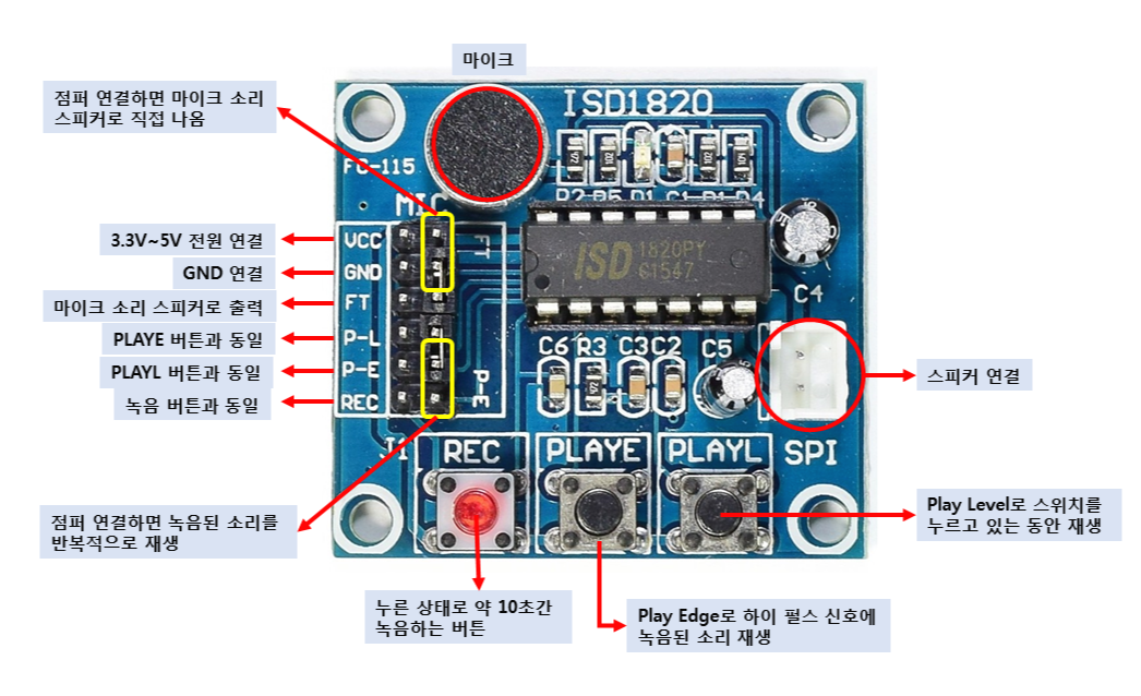 이전 포스팅에서 제작 배경에 대해 알아보았습니다. 구성품 테스트로 ISD1820 음성 녹음 및 재생 모듈을 실습합니다. ISD1820 모듈은 사용하기가 아주 쉽습니다. 마이크로 컨트롤러를 사용하지 않아도 사용해도 될 만큼 유용합니다.