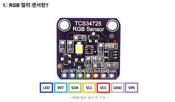 RGB 컬러 센서란 색상을 감지하는 센서입니다. CCD(Charge-Coupled Device)를 이용해 빛을 전하로 변환시켜 물체의 색을 감지할 수 있는 센서입니다. 색을 붉은색, 녹색, 파란색으로 표현할 수 있는 RGB를 사용해 나타 냅니다.