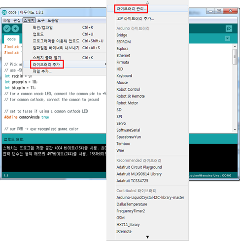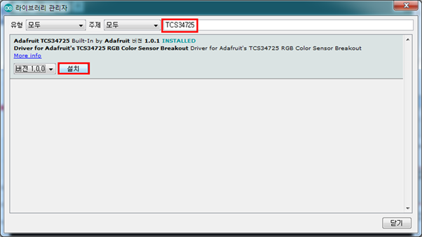 컬러 감지 센서를 사용하기 위해 Adafruit_TCS34725 라이브러리를 설치합니다. 아두이노IDE에서라이브러리를검색하여설치가가능하며, 아래 설치 방법으로 확인할 수 있습니다.