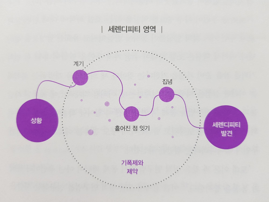특정한 우연이 단발성 사건이라면, 세렌디피티는 지속적인 과정이다. 뜻밖의 일이나 우연도 중요하지만 그건 시작점일 뿐이다. 예상치 못한 발견을 이해하고 지렛대로 활용할 핵심적인 다음 단계를 거쳐야 한다. 남들이 틈을 발견할 때 우리는 연결 고리, 즉 ‘관계’를 봐야 한다. 이때 진정한 가치를 걸러내는 지혜와 본질을 파악하려는 집념이 필요하다. 누구나 세렌디피티의 잠재적인 촉발점을 마주할 수는 있지만 흩어진 점을 잇는 노력이 없다면 세렌디피티를 기대할 수 없다. 세렌디피티가 일어날 가능성이 있는 많은 경우를 생각해보라. 세렌디피티를 아예 보지 못했거나 봤지만 아무런 행동도 하지 않고 흘려보내지 않았는가? 혹시 최근에 사소한 부추김만 있어도 했을 일을 하지 못하고 이제 와서 “아, 뭐가 돼도 됐을 텐데.”라고 후회한 적이 있는가? 세렌디피티 사고방식을 길러야 하는 이유가 바로 여기에 있다. 「제1장 세렌디피티, 단순한 운일까?」 중에서