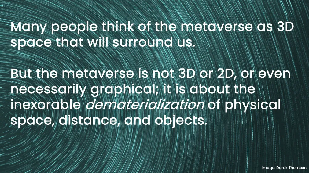 메타버스는 3차원이나 2차원, 심지어 필수 불가결한 그래픽에 대한 것이 아니라, 물리적 공간, 거리 및 대상의 거침없는 비물질화에 관한 것입니다.