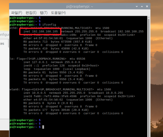 그리고 VNC로 접속하기 위해서는 라즈베리파이 IP 주소를 알아야되는데 터미널 실행 후 ifconfig 명령어로 확인해보자. IP 주소는 아래와 같이 192.168.168.105다.