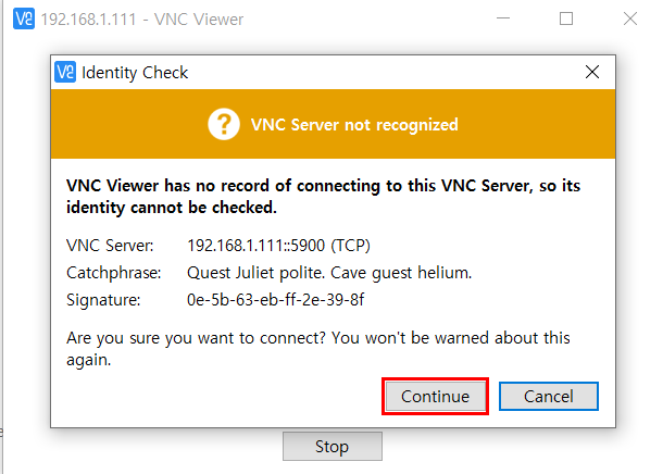 주소를 입력하면 중복이다~ 접속하겠습니까? 이런 메시지가나오는데 여기서나 SSH 에서나 continue를 누른다.