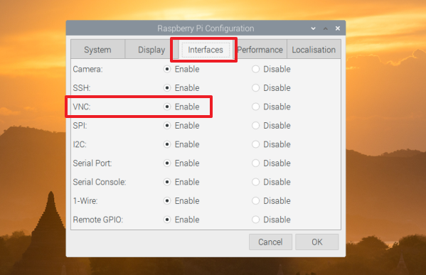 Interfaces에서 VNC Enable 을 선택합니다. 라즈베리파이 4 모든 기능을 사용하기 위해서 모두 enable 선택하기를 추천합니다요.