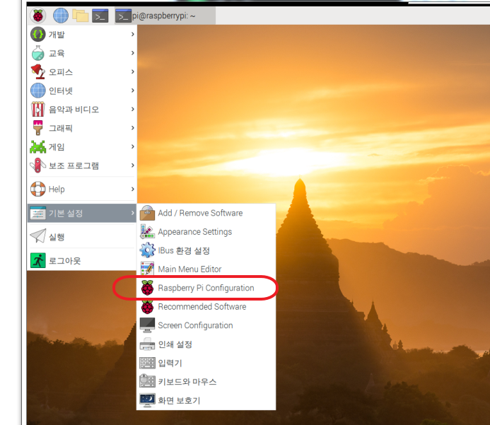 좌측상단 딸기를 누르고 메뉴에서 기본설정을 누르면 아래와 같은 메뉴에서 > Raspberry Pi Configuration 을 선택합니다.