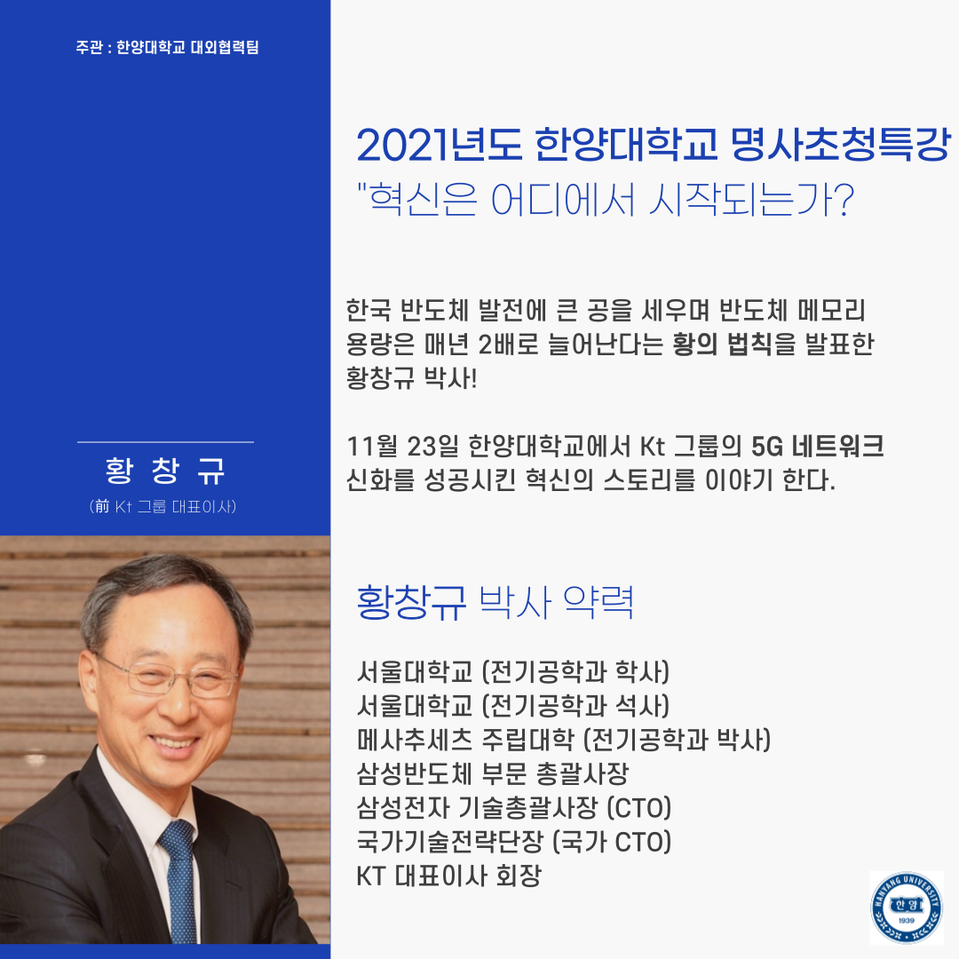 한양대학교에서는 KT그룹 대표이사 회장을 역임하신 황창규 박사를 모시고 ‘혁신은 어디에서 시작되는가?’ 라는 주제로 들어보려고 합니다. 황창규 박사는 삼성전자 기술총괄 사장 및 지식경제부 전략기획단 초대 단장, KT 대표이사 회장을 역임하였며 반도체 집적도는 1년에 두 배씩 늘어난다는 ‘황의 법칙’을 발표하며 반도체 분야의 권위자로도 인정받으셨습니다. 직원 여러분의 많은 관심 부탁드리며 참석하신 직원들께는 교양 마일리지 (2022년도 교양선택 100 마일리지)를 드립니다. 특강은 온라인 플랫폼(Zoom)을 통한 실시간 화상 강연으로 진행되며 강연을 보실 수 있는 기기 (PC 및 스마트폰/카메라 화상연결 필수)를 준비해주시기 바랍니다.