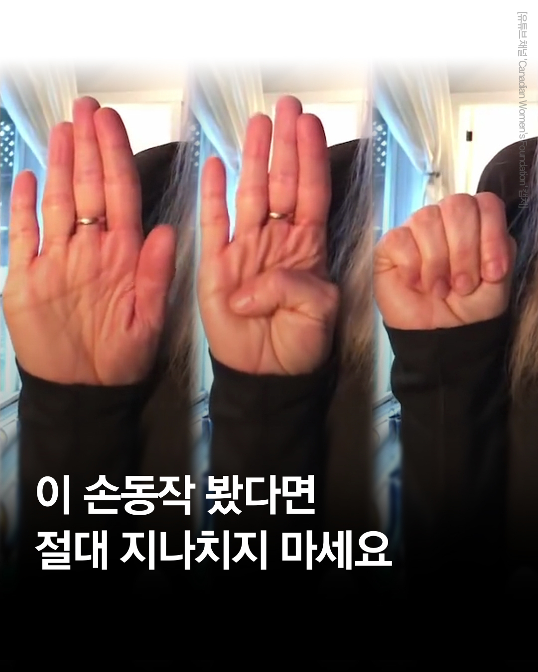 캐나다 여성기관에서 코로나 시국에 집에 갇혀 가정폭력에 노출된 사람들을 인지하고 구조할수 있도록 수신호를 만듦.