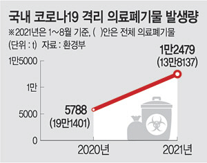 코로나19 바이러스의 빠른 창궐 속도로 말미암아 코로나바이러스 감염증 유행이 장 기화되며 우리 사회에 새로운 문제가 대두되었다. 팬데믹 시대에 따른 영향으로 곳곳에서 의료용 폐기물이 많이 발생되고 있는데, 특히 코로나19 확진자의 수가 꾸준히 증가하며 배출되는 의료폐기물의 처리 문제가 새롭게 해결해야 할 난제로 떠오르고 있다.
