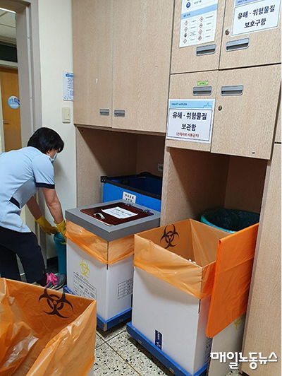 현재 병원 및 의원에서 발생한 의료폐기물의 일차적인 처리를 청소노동자가 도맡아 하고 있는데, 이때 의료폐기물 처리의 기술의 한계로 인하여 이들은 의료폐기물에 직접 접촉하여 폐기물들을 밀봉하고 운송하는 등의 과정을 거친다. 다음 사진들은 청소하는 과정에서 직접 접촉하여 의료폐기물을 처리하는 청소노동자들의 모습을 담은 것이다.