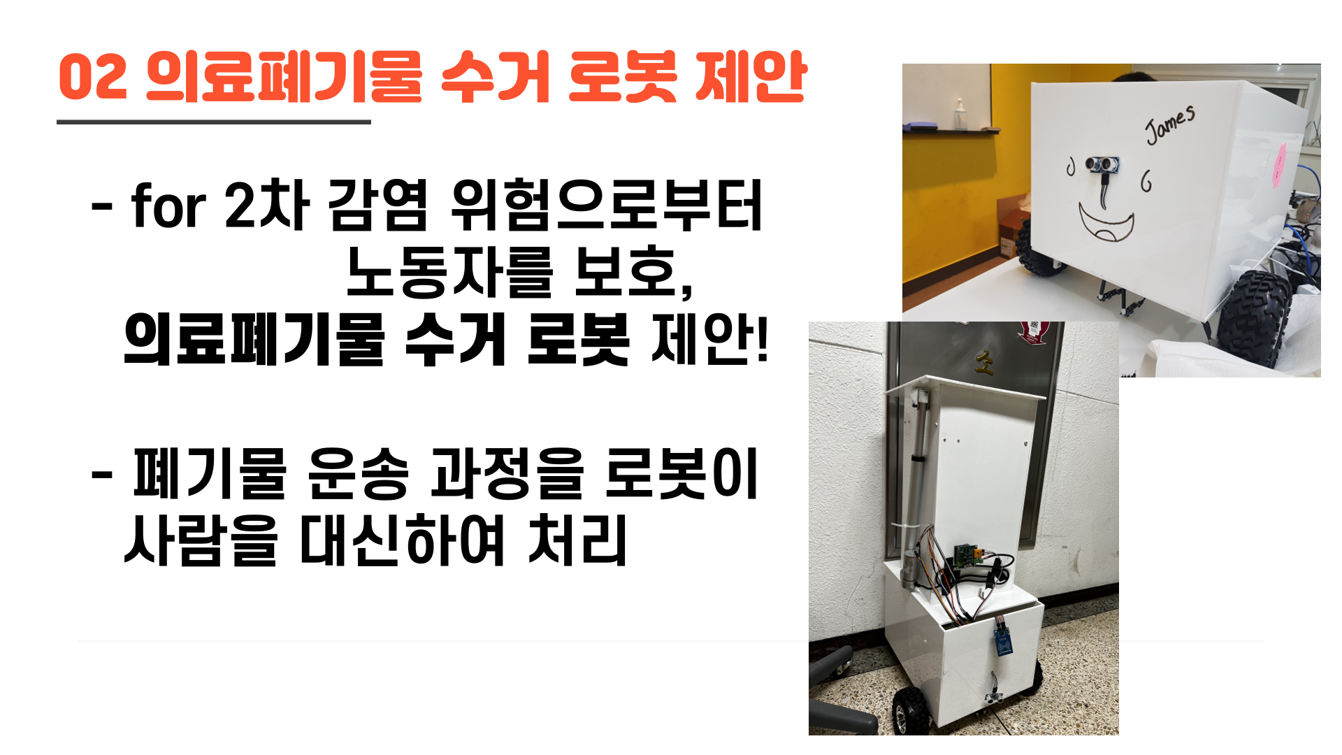의료 폐기물 처리 로봇은 오염된 의료폐기물을 접촉 없이 수거, 밀봉하는 기능을 한다. RFID 태그가 인식되면 리니어 액추에이터를 통해 쓰레기통의 뚜껑을 들어 올리고, 한 번 더 태그 하게 되면 열선 모듈을 통해 열을 주어 쓰레기가 담긴 비닐봉지가 밀봉된다. 처리된 폐기물은 로봇은 주어진 경로를 따라가고 진행 경로상의 장애물이 인식되면 정지하게 된다. 이러한 기 능들을 구현하기 위한 원리와 개발과정, 소프트웨어 교육에 필요한 내용을 기술한다.