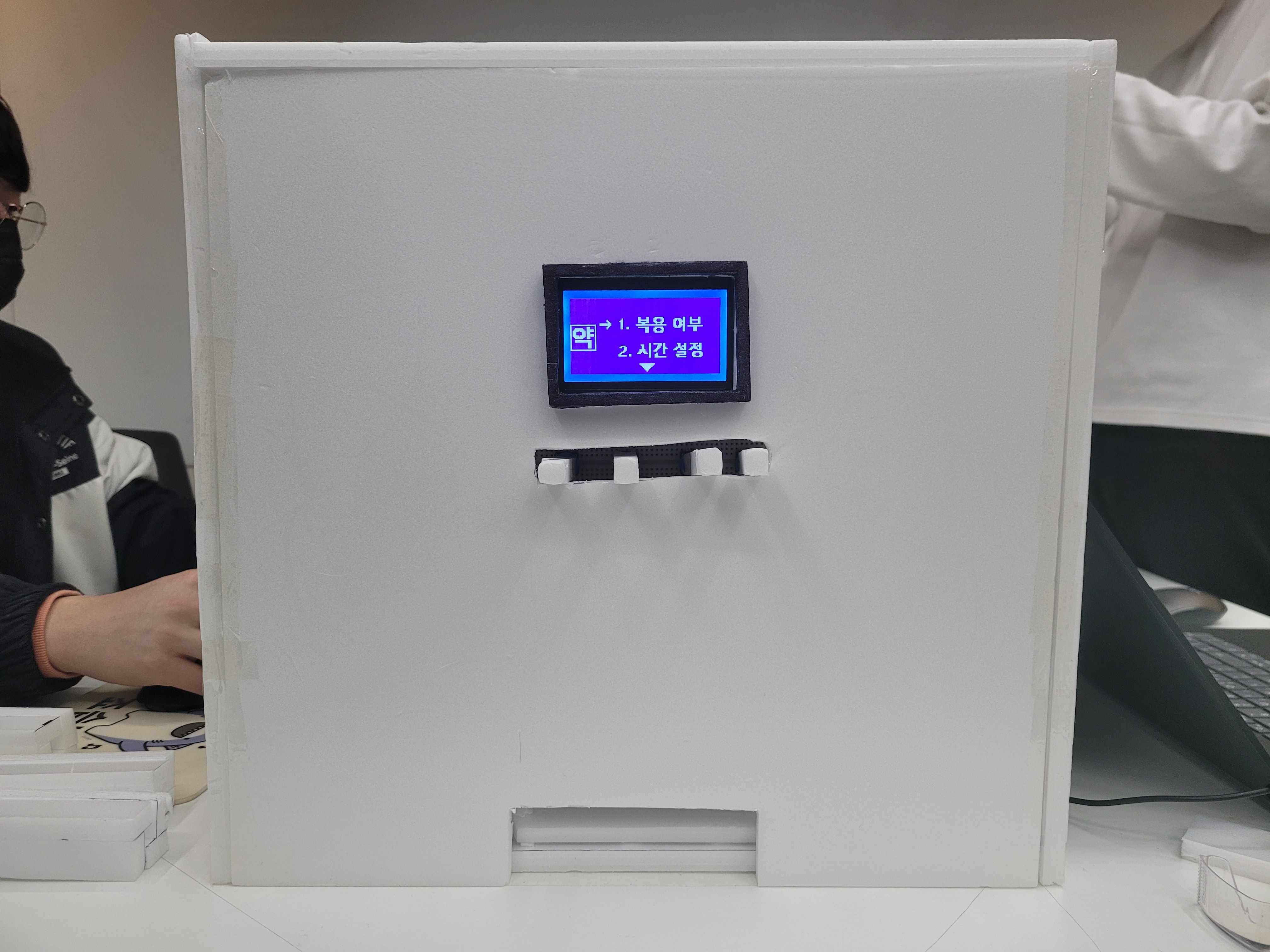 우리 조에서 개발한 미니약국 은 인간의 건강에 있어 꼭 필요한 약들을 적절한 시간에 맞게 복용할 수 있도록 도와주는 제품이다. 약을 보관해 놓았다가 제공할 뿐만 아니라 LCD 화면을 통해 약을 복용한 날짜를 모니터링하고 알림 방식을 설정할 수 있다 또한 음향 장치와 블루투스를 이용한 메시지를 통해 이용자에게 약을 먹을 시간에 맞춰 알림을 보낼 수도 있다.
