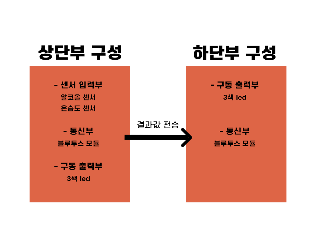 기본적으로 센서 입력부, 통신부, 구동 출력부로 구분할 수 있다. 물리적인 위치로 구분하면 상단부, 하단부로 구분이 할 수 있다. 상단부와 하단부의 통신은 블루투스로 이루어져 상단부에서 판단한 사용자의 음주 유무로 하단부 차단장치의 lock on, lock off를 결정한다.