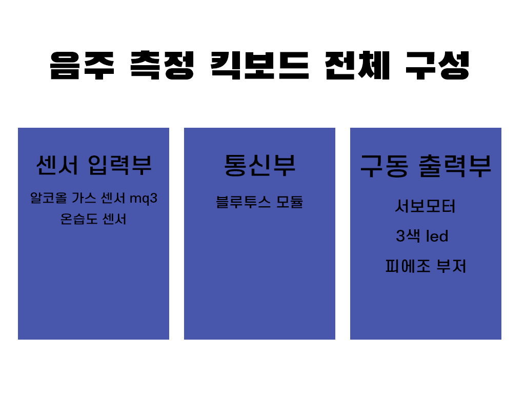 음주 측정 키보드는 상단부와 하단부로 구성된다. 상단부는 사용자의 음주 유무를 판단하기 위한 감지부( MQ3알코올 센서, 온습도 센서 )와 제품의 상태를 사용자에게 전달하는 led,피에조 부저 , 하단부와의 통신을 위한 블루투스 모듈로 구성되어 있다. 하단부는 킥보드 사용을 차단하기 위한 서보모터와 상단부와의 통신을 위한 블루투스 모듈로 이루어져 있다. 이에 대한 외관 이미지 및 기능 설명을 아래에 나타내었다.