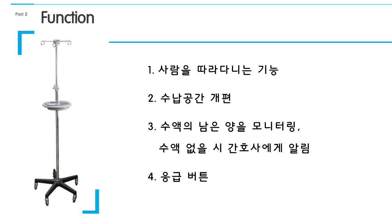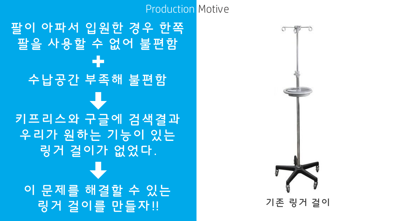 작품 제안을 한 학생이 병원에 입원했을 때 링거걸이를 사용하면서 불편했던 점을 개선하기 위해 고안한 프로젝트였다. 링거걸이도 30년 동안 변하지 않았다. 한 손으로 잡아 끌거나, 화장실갈 때, 다른 손으로 무엇인가 할 때도 불편하다. 아주 창의적인 아이디어고 개선이 이루어져야 할 의료 분야다. 환자가 링거걸이을 사용할 때 양손이 자유롭고, 사용자와 함께 이동하고, 여분의 수납함이 있는 링거걸이를 만들기 위한 작품이다. 학생들이 한 학기 작업한 결과물이 단순히 작업하고 나서 사라지는 일은 아쉬운 일이라서 아래 전체 팀 프로젝트 리스트를 소개한다. 참고하세요.