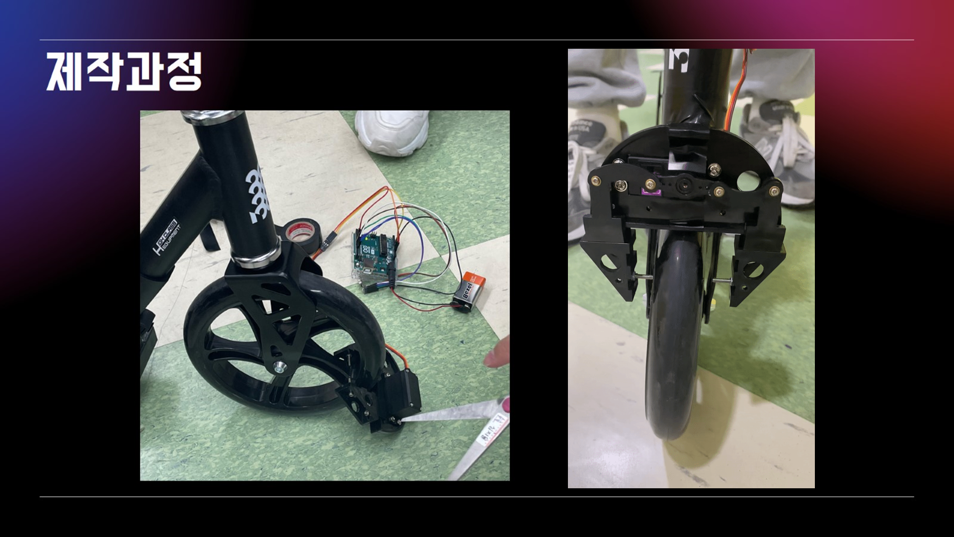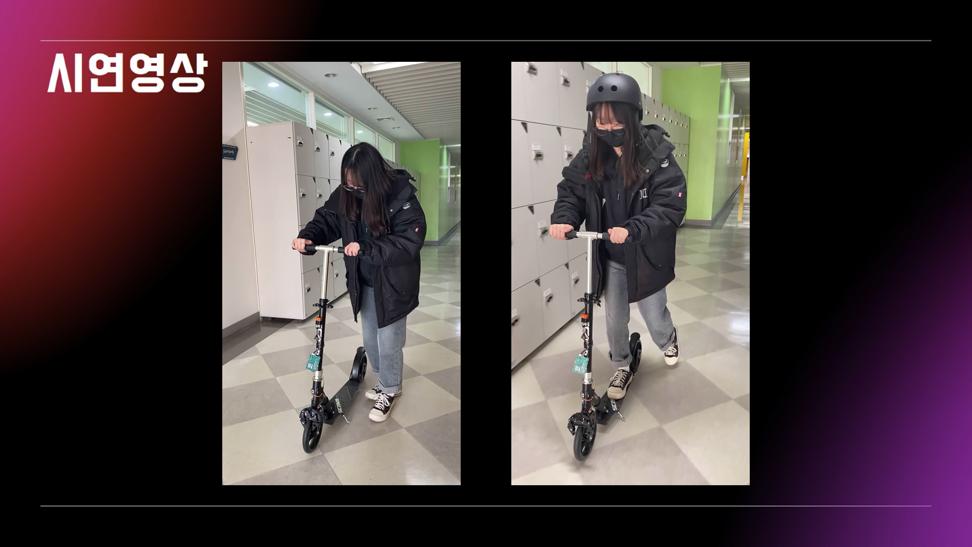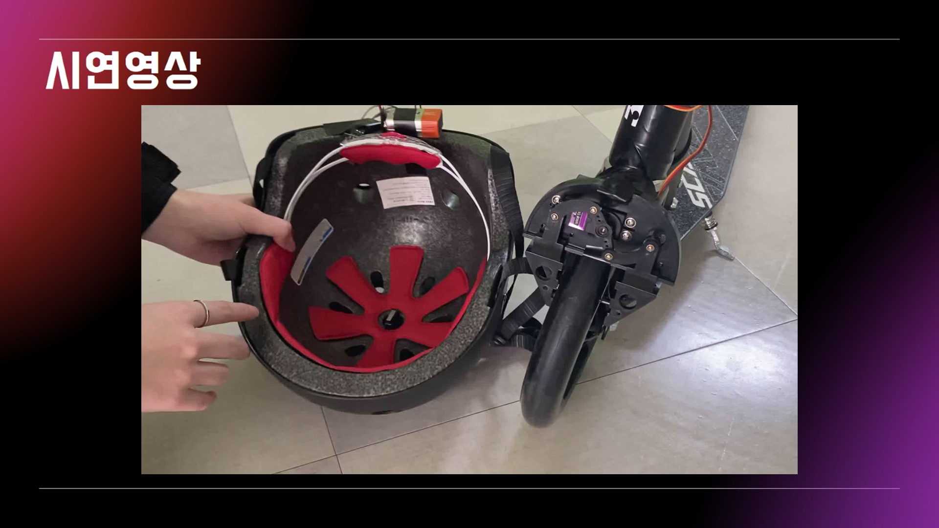 전동 킥보드 운행 시 착용하는 헬멧에 인체 인식 장치를 부착하여 운행자가 헬멧을 착용한 것이 확인되는 경우 바퀴에 걸려있는 잠금장치가 해제되며 운행을 할 수 있게 한다. 만약 운행자가 헬멧을 착용하지 않으면 바퀴에 있는 잠금장치로 인해 운행을 불가하게 만드는 작품이다.