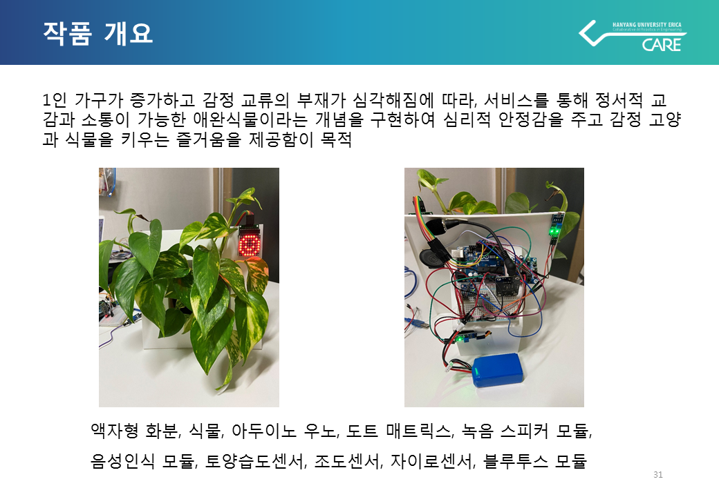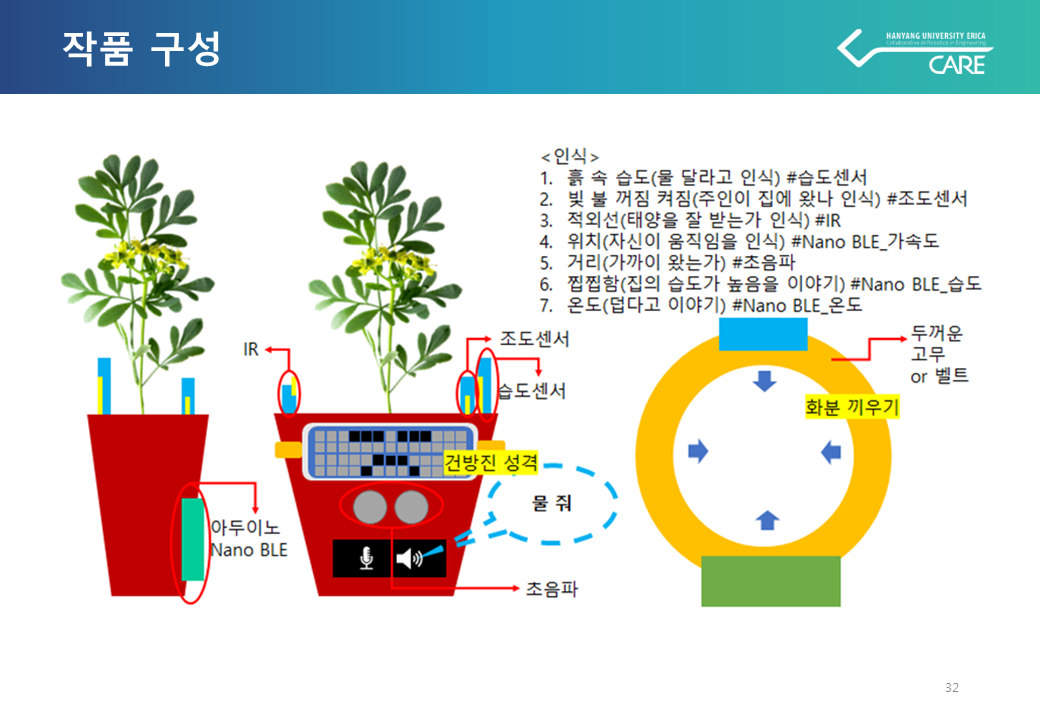 기본적으로 정적인 모델로서 사용자와 상호작용을 통해 작동되며, 식물의 상태가 블루투스 통신으로 스마트폰 앱과 연동되어 좀 더 많은 서비스를 제공한다. 도트 매트릭스로 식물의 표정을 구현했으며, 녹음 스피커 모듈로 식물의 음성을 나타냈다. 토양습도센서를 통해 수분이 부족해질 때 사용자가 이를 인지할 수 있게 표정 변화와 음성 출력을 하며, 블루투스 통신을 통해 변화한 습도 값이 스마트폰 앱으로 전송된다. 조도센서를 통한 밝기 변화와 자이로 센서를 통한 화분의 움직임을 감지하여 각각의 상황에 따른 표정과 음성이 출력된다.