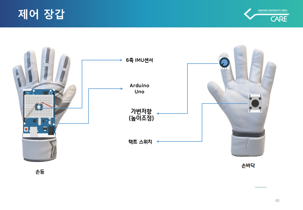 컨트롤러를 사용하지 않고, 장갑에 필요한 센서들을 설치했습니다. 6축 IMU 센서, 가변 저항, 택트 스위치의 값을 입력시켜 주기 위해 시리얼 통신과 아두이노 우노 보드를 사용합니다.