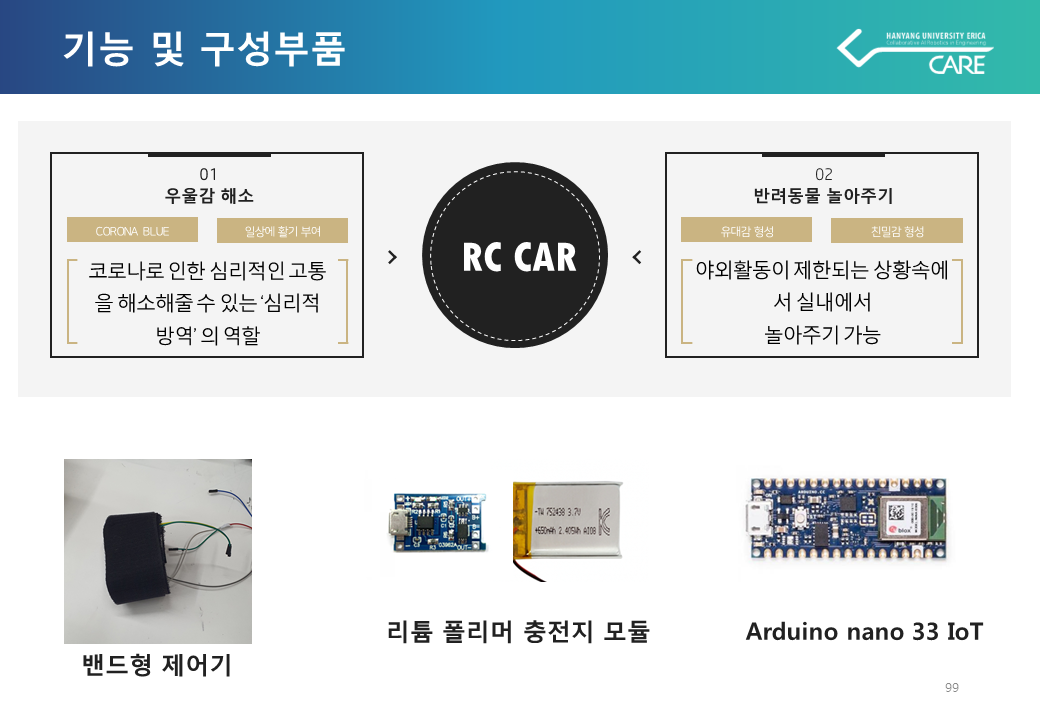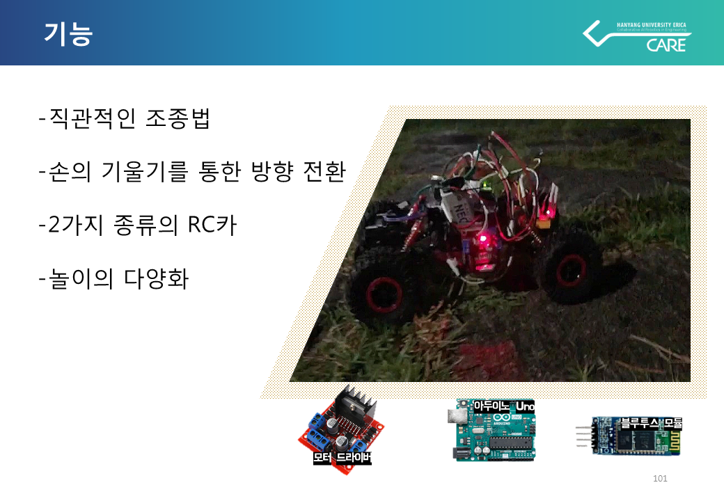 관성센서로 조종하는 RC CAR는 예상치 못한 상황으로 지루한 일상을 보내고 있는 현실에서 야외활동이 제한되는 상황에서도 이 지루함을 해소시켜 보고자 재미와 놀이에 초점을 맞추어 제작하게 되었습니다.