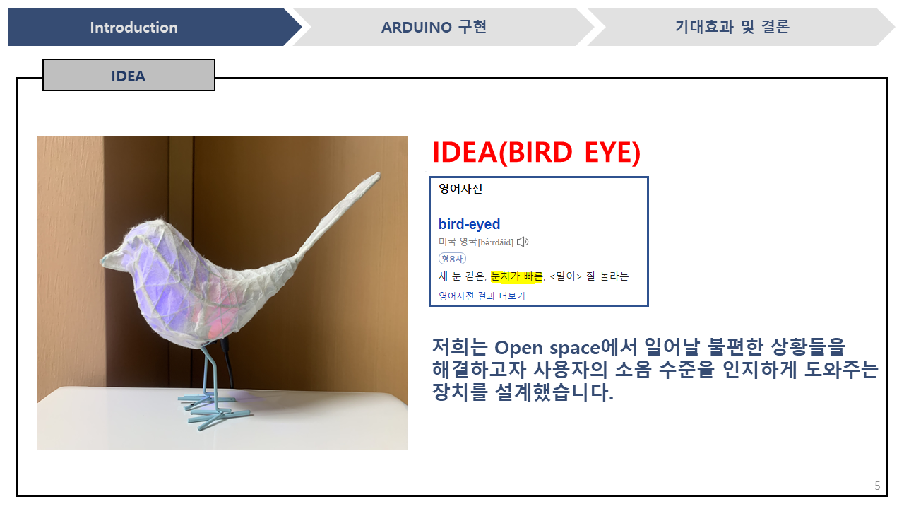 ‘Bird-eyed’는 형용사로 ‘눈치가 빠른’이라는 뜻을 가지고 있는 영단어이다. 우리는 이로부터 아이디어를 얻어서 ‘소음을 내는 이용자에게 조용히 경고(눈치)를 준다’라는 의미로 새 모양의 소음 감지 장치를 만들기로 하였다. 먼저 여러 구역에 소음 감지 장치를 설치한 후 전원을 연결시키면 이 장치에 장착되어 있는 사운드 센서를 이용해 소음을 감지한다. 소음이 우리 정한 일정 수준에 다다르면 LED에 빛을 내고 그 정보를 중앙으로 보내 어느 위치에서 어느 정도의 소음이 발생하였는지 LCD로 출력하는 제품을 만들기로 하였다.