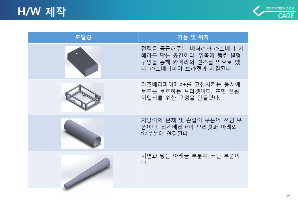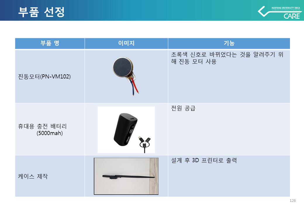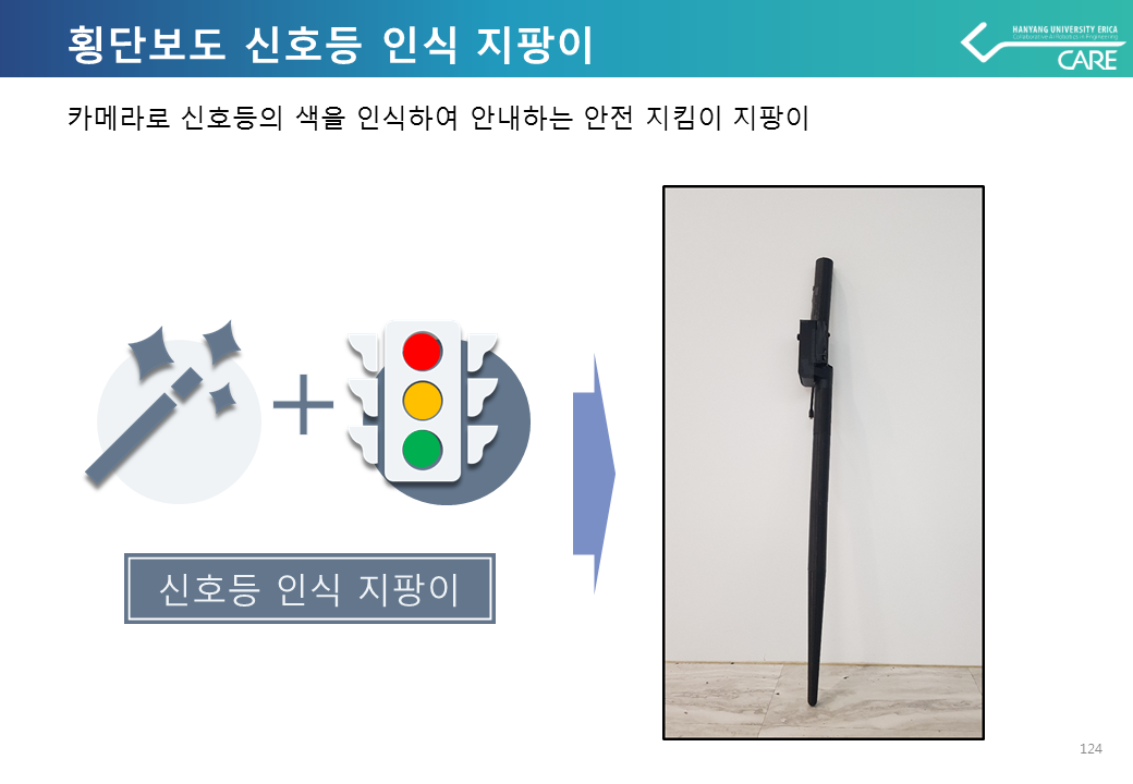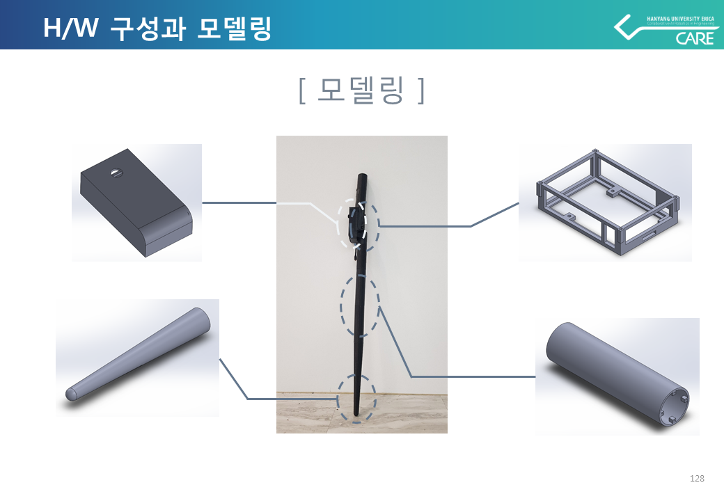 셋째, 스마트 디바이스. 지팡이의 손잡이 부분에 디바이스를 설치하여 웨어러블 로봇과 비슷한 기능을 구현한다. 본 작품으로 구현하기 좋은 기능은 전화 기능, 심박수 측정 등의 헬스케어 기능, 긴급 구조 요청 기능 등이다. 이때, 시각이 불편한 시각 장애인들에게 최적화하기 위해, 디바이스는 진동과, 음성, 촉감을 사용한다.