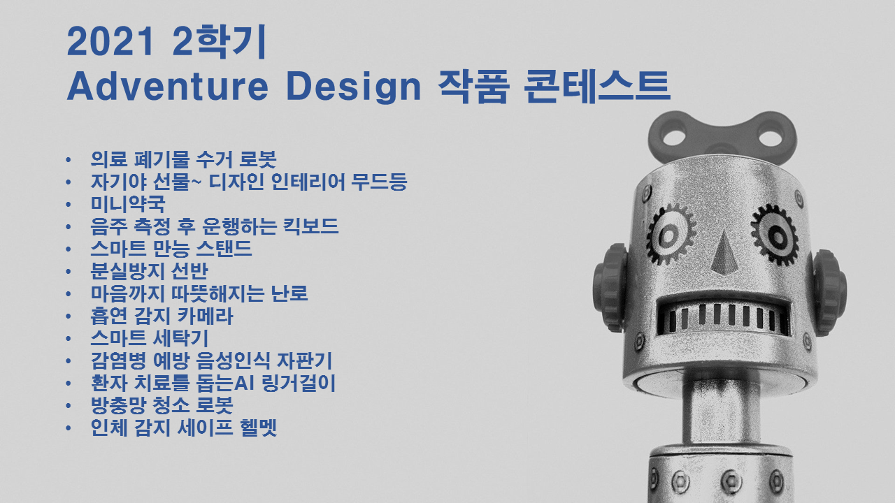 아이들도 서로 다른 방식과 여정을 통해 삶을 살아가지만 우리와 분명히 다름을 알고 있다. 아직 늙기엔 너무 어린 아이다. 어드벤처 디자인은 제한이나 규칙, 경계가 없는 아이디어를 구상하여, 설계하고 직접 제작하여 멋진 작품을 만드는 일이라서 주로 응용분야에 속한다. 아직 기술적으로 구현하고 싶지만 제대로 만드는 방법에 관한 지식은 많지 않다. 그러니 작품을 제작하는 과정이 즐겁고 재미있는 일이고, 팀을 이루어하는 일이 무엇을 의미하는지, 결과가 제재로 나오든 나오지 않든 포기하지 말고 끝까지 도전하는 방법을 익히는 일이 무엇보다 중요하다. 전공에 대한 지식이 폭넓게 늘어나는 고학년이 되면 캡스톤 설계나 자주 열리는 해커톤 등이 학생들의 작품을 더욱 수준 높게 만드는 데 도움이 된다. 아이들이 놀라운 결과를 보여준 이유를 나름대로 적어보면