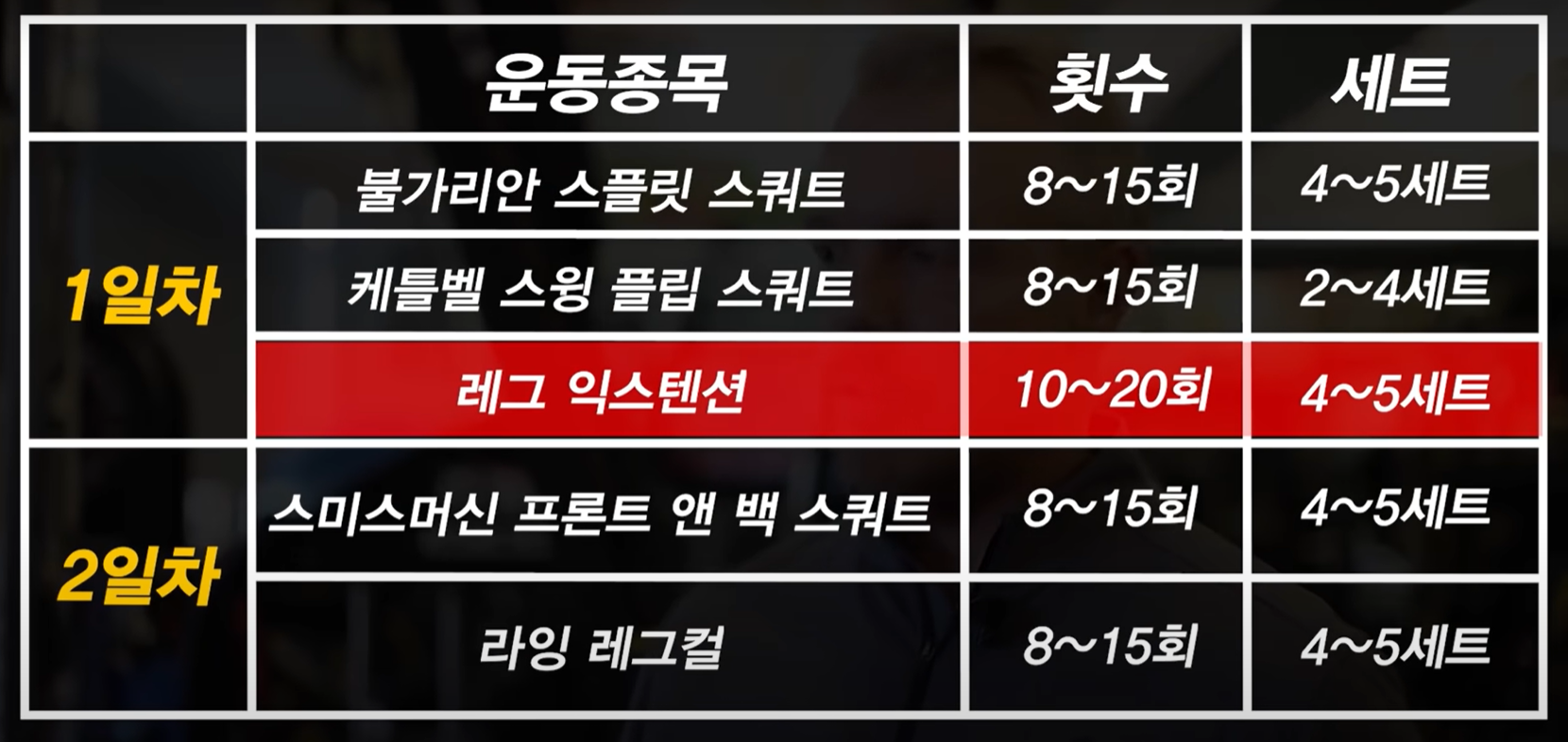 1일 차에는 불가리안 스플릿 스쿼트, 케틀벨 스윙 플립 스쿼트, 레그 익스텐션 이렇게 세 가지 운동을 수행해 줍니다. 유튜브 영상을 참고하세요.