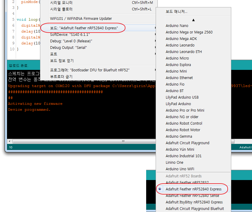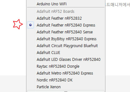 일단 Adafruit Feather nRF52840 Express 부트로더를 업데이트 하기 위해 보드를 선택합니다.