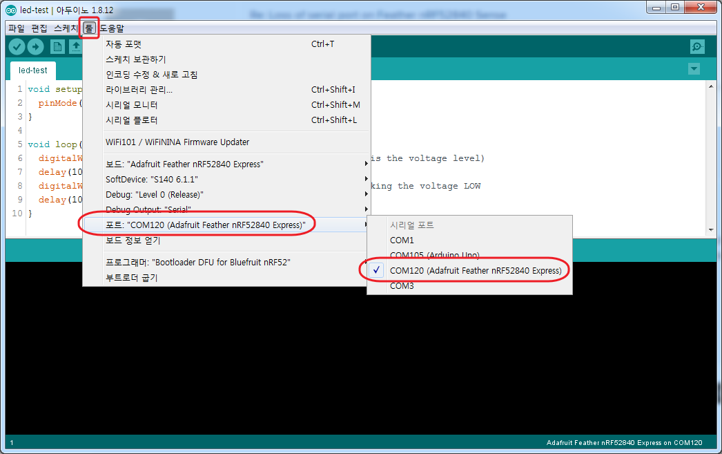 일단 여기까지 하셨으면 다음이 중요한데요. Adafruit Feather nRF52840 Express 보드와 포트를 설정하고, 부트로더를 업데이트 하는 과정입니다. 천천히 따라하시면 됩니다. 처음에 아두이노 IDE 환경에서 nrf52840 보드가 제대로 보이시지 않아도 당황하지 마시고 하나씩 점검하시면 나중에 드라이버가 잘 설치되어 보이실테니 차근차근하시기 바랍니다. ^^