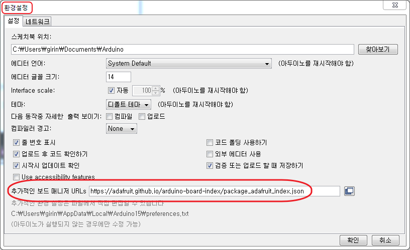 파일 -> 환경설정으로 가서 "추가적인 보드 매니저 URLs" 박스에 다음과 같이 입력하세요.