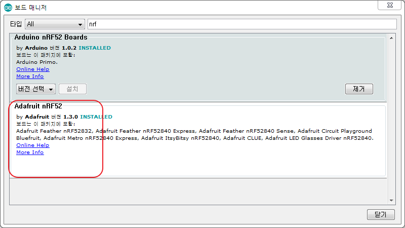 다음은 nrf52840 보드를 설정할 차례입니다. 툴 -> 보드 -> 상단의 보드 매니저를 선택하고 검색창에 "nrf"를 넣고 검색하여 아래와 같은 패키지를 설치합니다. 중간에 뜨는 창에서 모든 드라이버 파일도 함께 설치하시면 됩니다. 아래 이미지를 보시고 설치하세요. 시간이 조금 걸립니다.