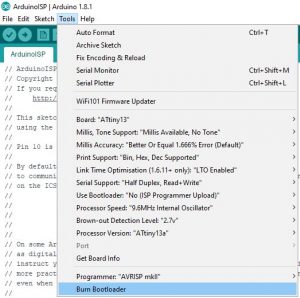 실제로 부트로더는 직렬 통신을 통해 새 펌웨어를 설치할 수 있는 마이크로컨트롤러의 펌웨어입니다. ATtiny 13 프로그래밍을 시작하려면 부트로더를 구워야 합니다. 이를 달성하기 위한 두 단계가 있습니다.