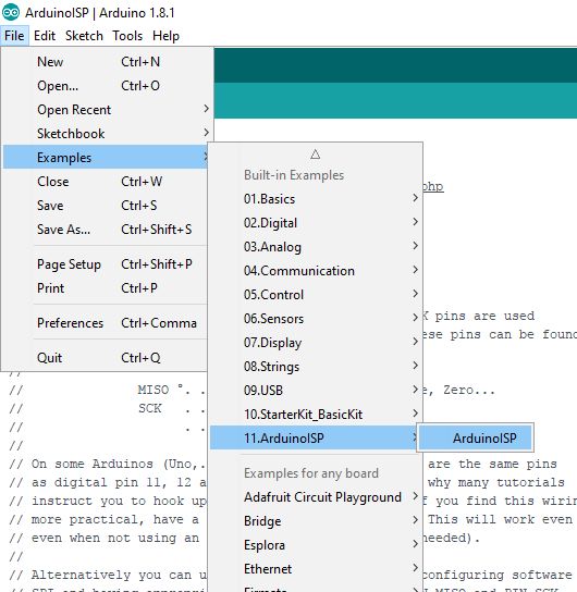 ATtiny13을 프로그래밍하려면 Arduino를 프로그래머로 설정해야 합니다. 이것은 IDE에서 이 경로(파일 -> 예제 -> ArduinoISP)를 따라 ArduinoISP 스케치를 Arduino에 업로드하면 발생할 수 있습니다.