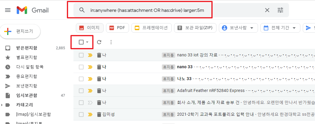 구글 지메일 용량이 점점 늘어나면 지우기도 함들고 할 때 아래 방법을 쓰면 조금 좋아질 겁니다. 말 그대로 첨부파일로 5M byte 넘는 이 메일을 삭제하는 방법입니다.