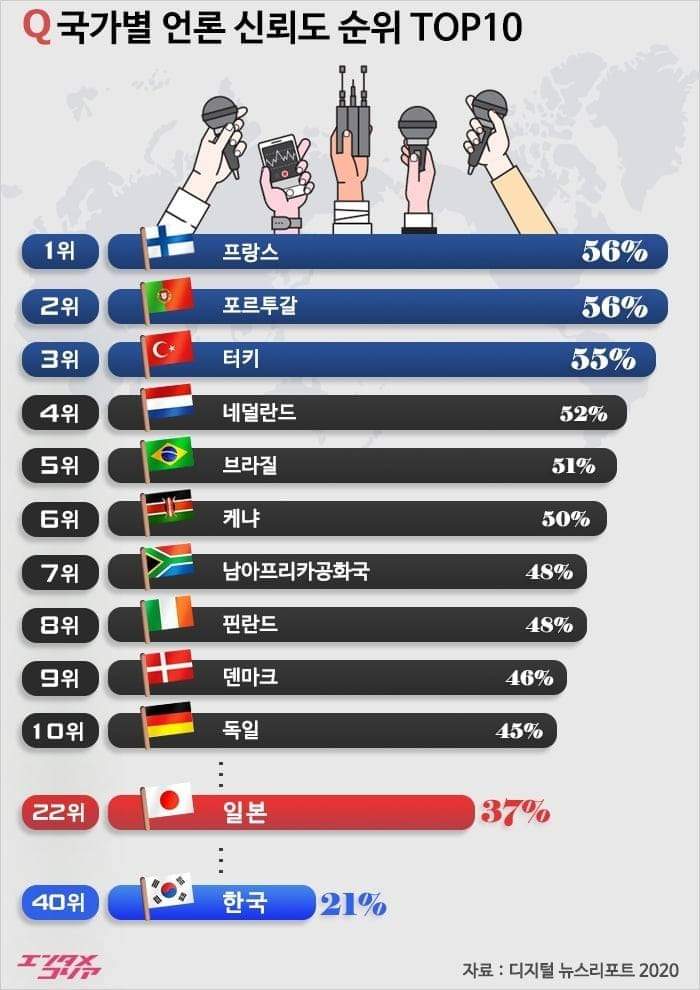 한국 언론 신뢰도, 5년 연속 최하위 불명예, 영국 옥스퍼드대학교 부설 로이터저널리즘연구소가 발간한 ‘디지털뉴스 리포트 2020’에서 한국은 언론 신뢰도 21%로 조사 대상 40개국 중 최하위로 집계됐다.