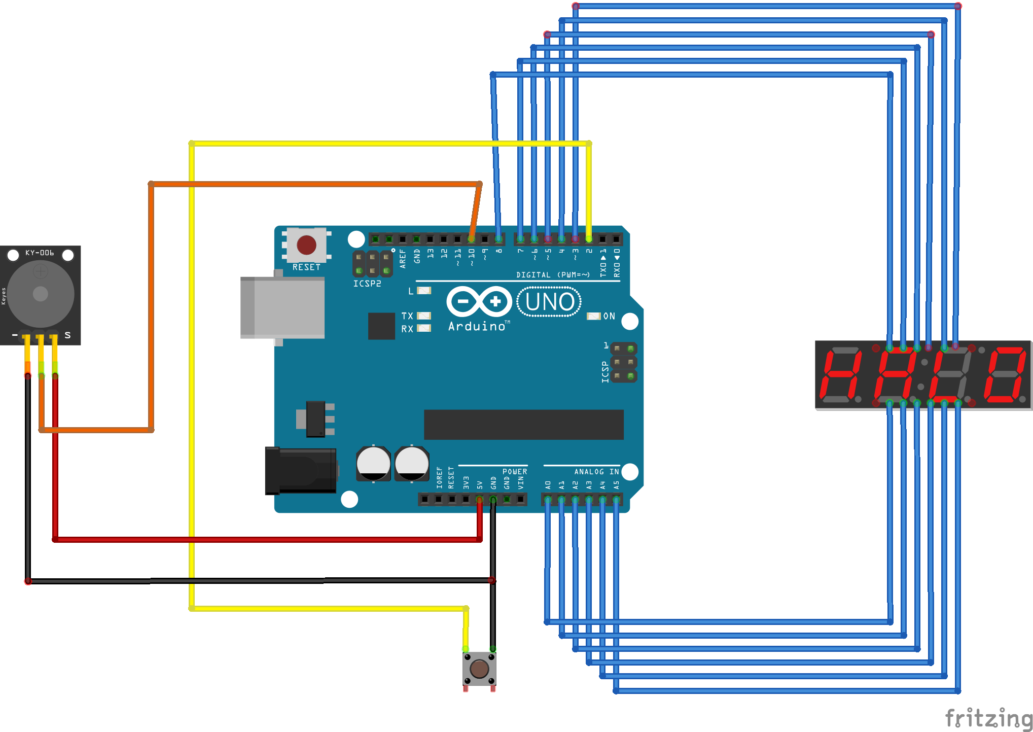 회로 연결도는 아래와 같다. 여기서 부저는 연결하지 않아도 되고, 주로 7 segment 연결도를 참고하시면 됩니다.
