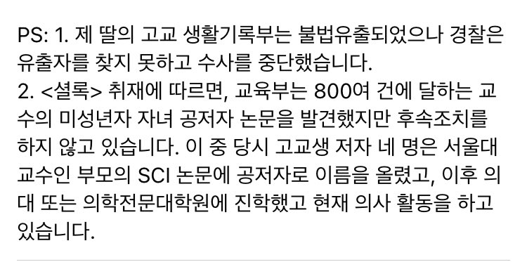 "부산대와 고려대가 각각 제 딸의 입학을 취소했습니다. 아비로서, 송곳으로 심장을 찌르고 채칼로 살갗을 벗겨내는 것 같은 고통을 느낍니다."